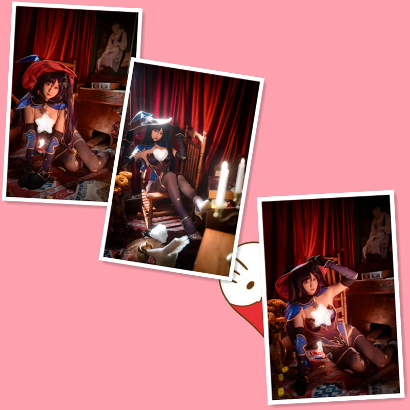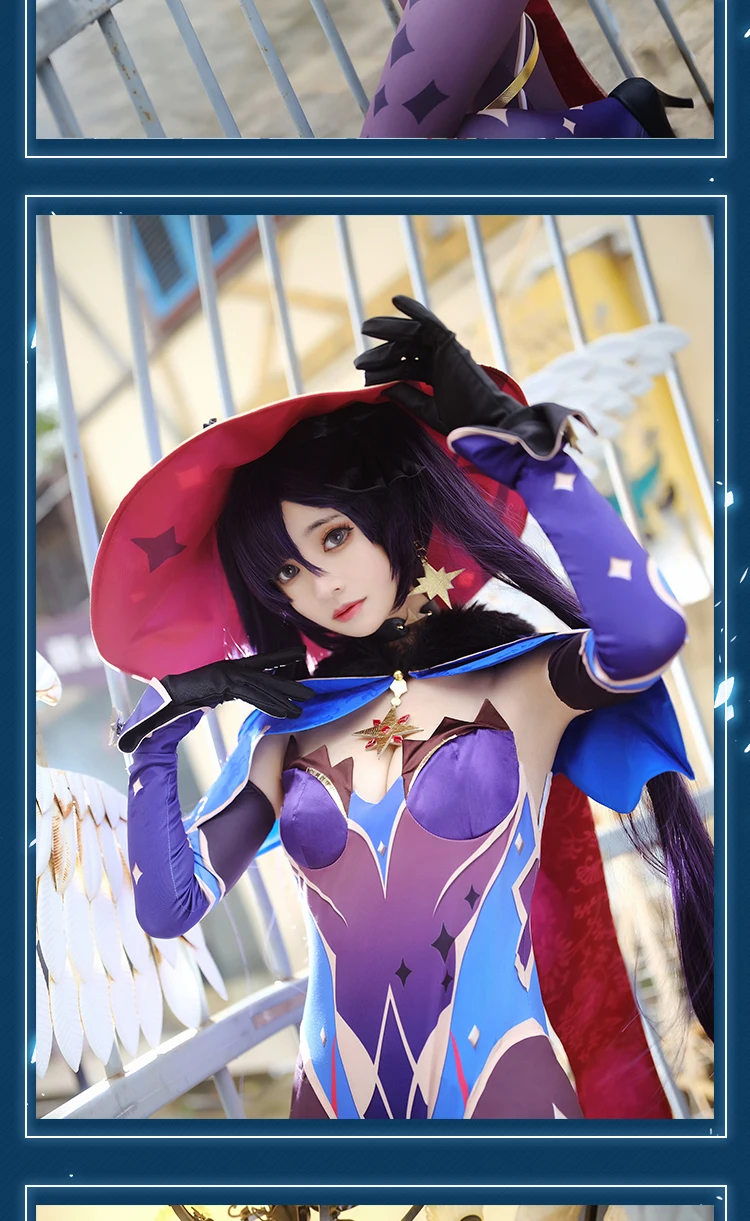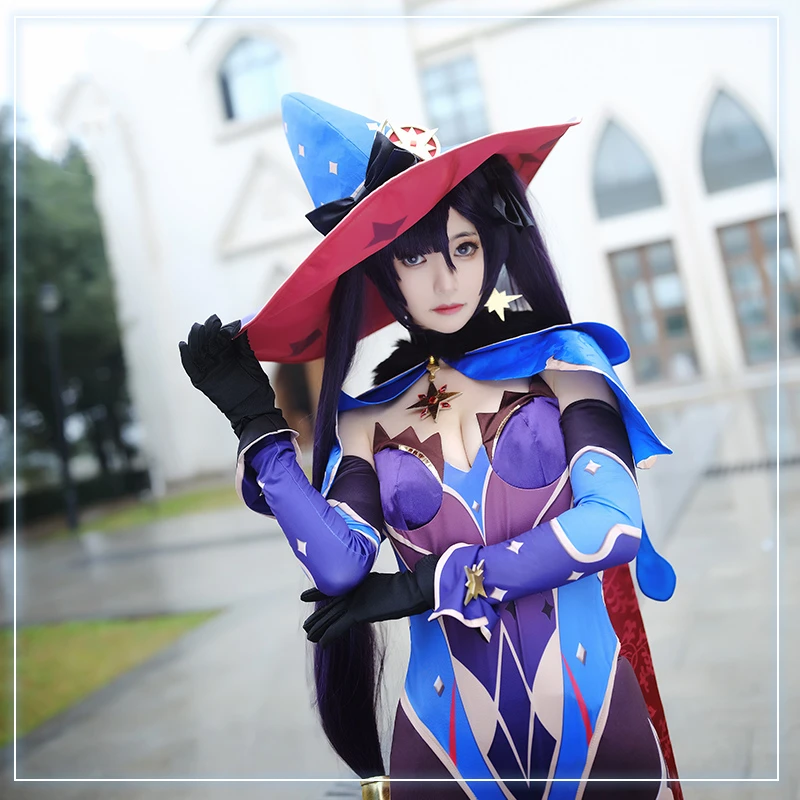 Game Genshin Impact Mona Cosplay Costume Hat Earrings Anime Wig Women Sexy Halloween Party Dress Body Suit