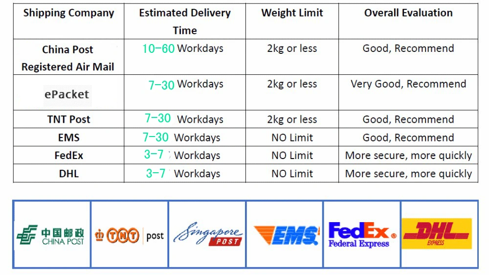 Packages from our warehouse in China will be shipped by ePacket or EMS depending on the weight and size of the product. Packages shipped from our US warehouse are shipped through USPS.